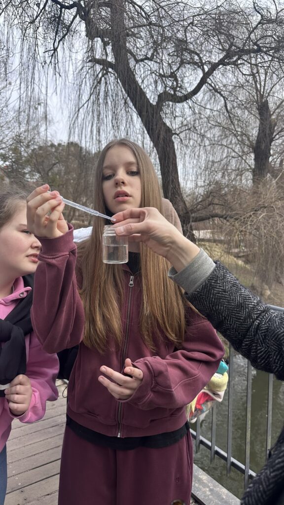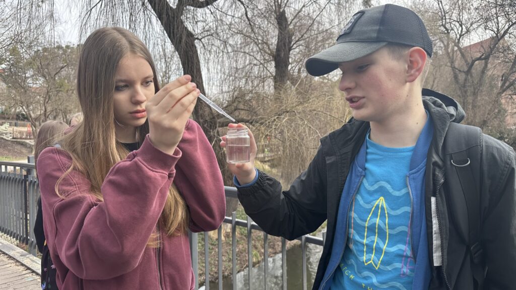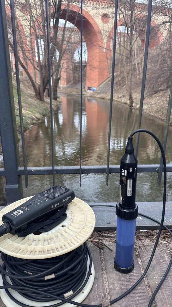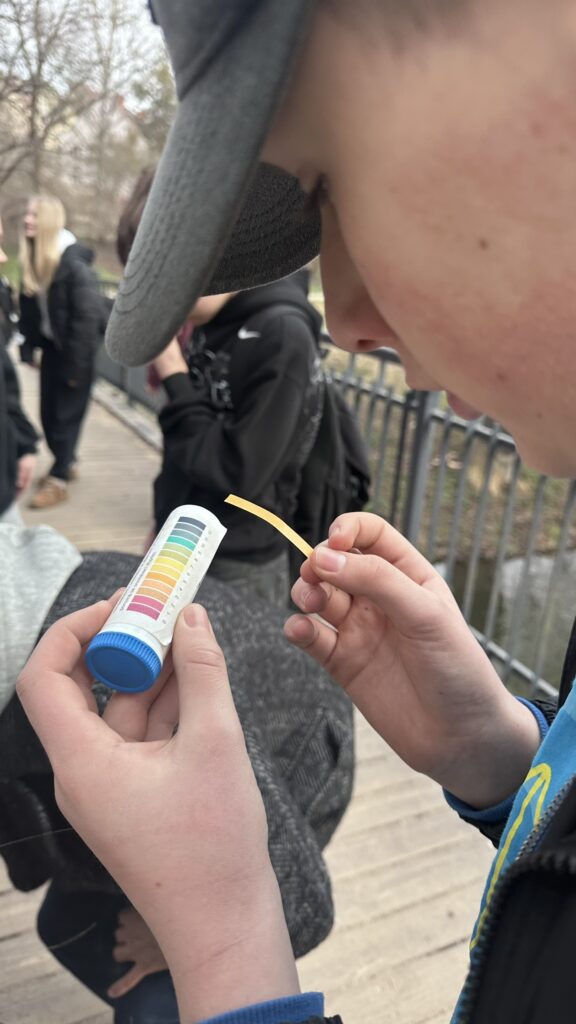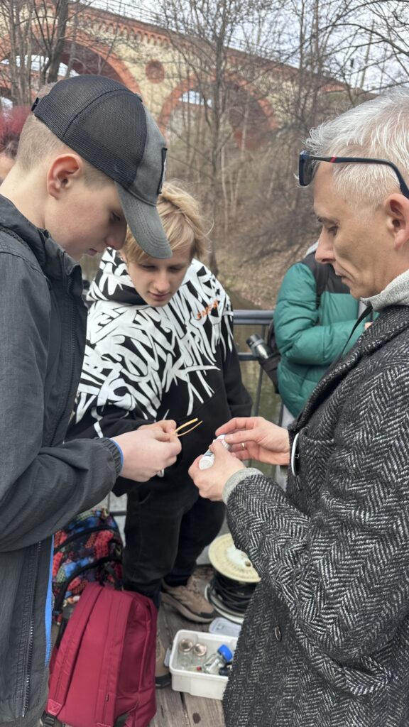 Dr. Konrad Stawecki poprowadził grupę nad rzekę i zaprezentował specjalistyczny sprzęt do badania H2O. Uczniowie zmierzyli temperaturę wody, ilość tlenu i nasycenie wody tym gazem, a także przewodnictwo elektrolityczne, które mówi o zasoleniu. Wspólnie sprawdzaliśmy różnice tych parametrów między strefą przybrzeżną i otwartą wodą – tam obserwowaliśmy też, co i jak zmienia się wraz ze wzrostem głębokości. Wykonaliśmy eksperymenty, dzięki którym porównaliśmy jak na jakość wody wpływają zanieczyszczenia – porównaliśmy np. jak pod wpływem soli zmienia się przewodnictwo wody jeziorowej, a jak destylowanej. Mierzyliśmy pH (odczyn) wody i wyjaśnialiśmy sobie, dlaczego się ono zmienia.