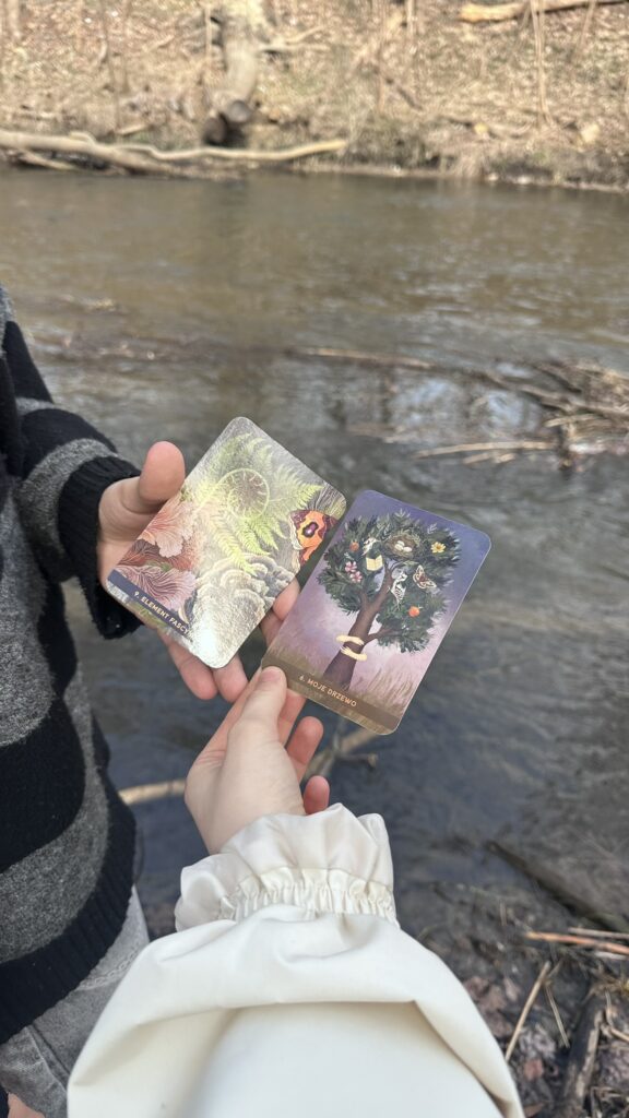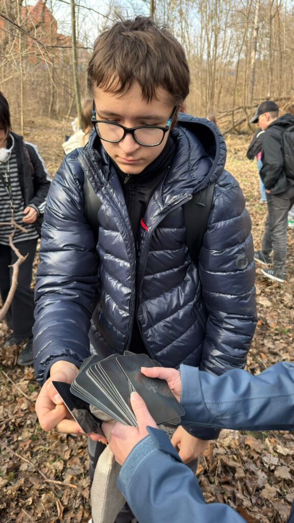 Ostatnie minuty spotkania upłynęły na kąpieli leśnej przeprowadzonej przez Izabelę Sałamachę. Pracowaliśmy z kartami „Moc lasu”. Każdy wylosował swoją indywidualną kartę z hasłem, którą interpretował samodzielnie w wybranym przez siebie miejscu.